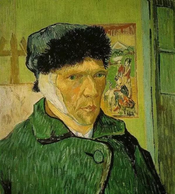 《割耳後的自畫像》,文森特·梵高(1889年)飽受精神病折磨的梵高身陷修道院,旁人無力拯救他的絕望。在這幅畫中,梵高切掉了自己的左耳,他湛藍的眼睛尖銳而有穿透力,置身事外地看著畫中人臉上的傷。你既不能說他正常,也不能稱他為瘋狂,他隻是一位勇敢而誠實地敞開心扉的普通人。