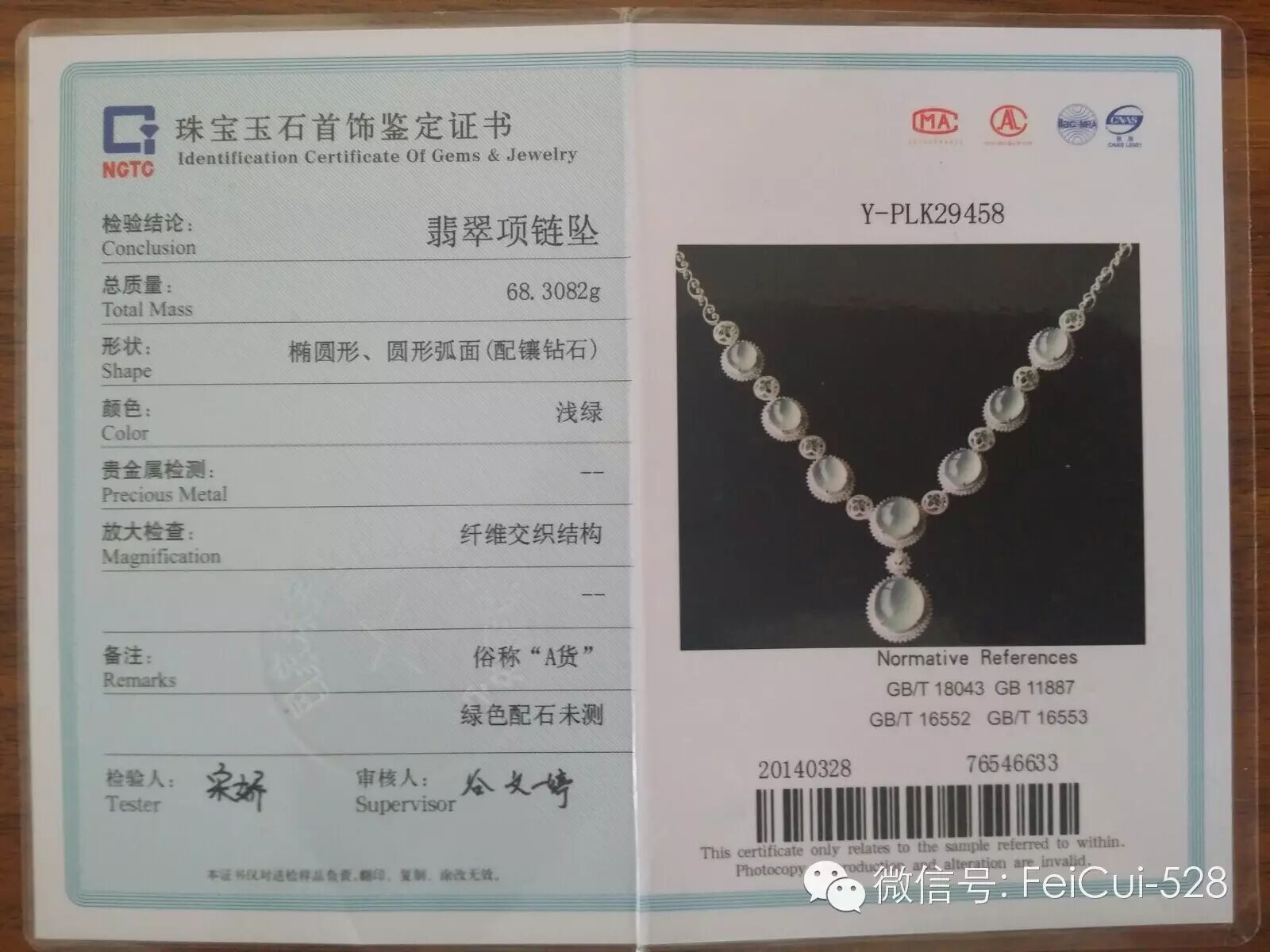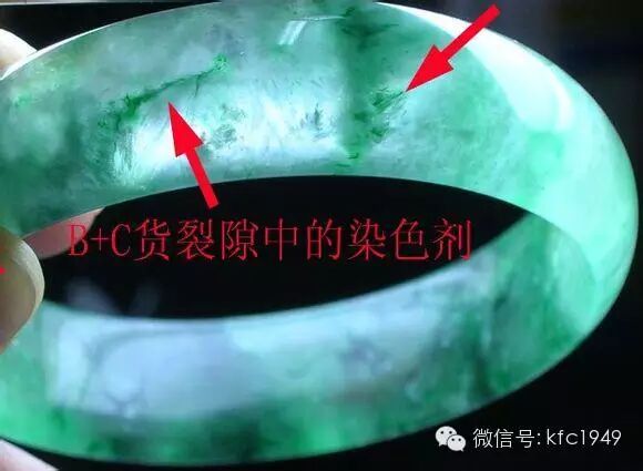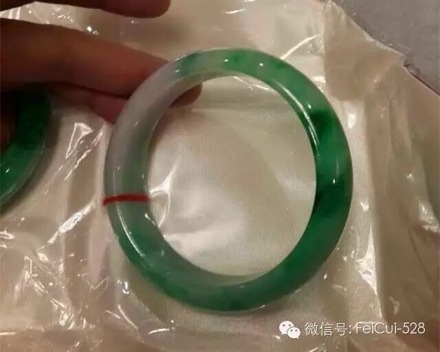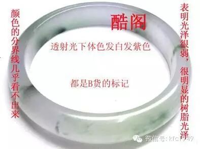 鐲子本身看,顏色濃艷而地子純白並且帶有熒光,所以可以斷定是B的。(地子純白並且帶有熒光A貨的地子是略帶黃味的,並且有結構的。如果純白又有強烈熒光,還找不到清晰結構的.那是注人了膠的結果。)