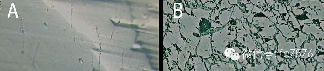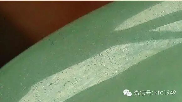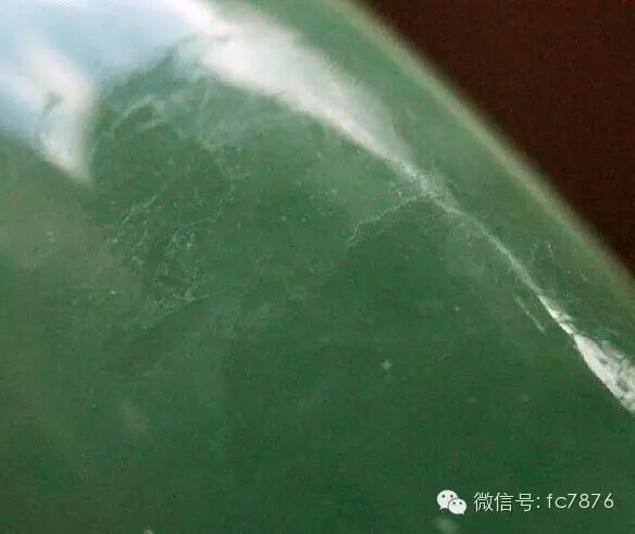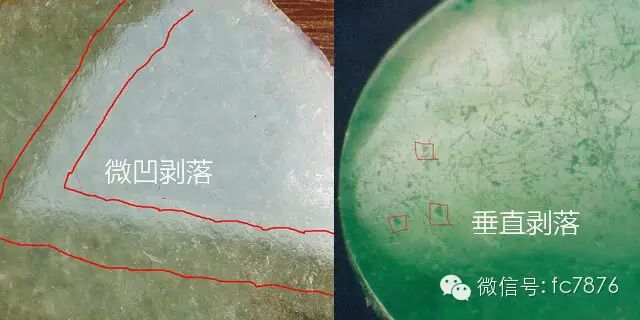 (5)A貨翡翠:微凹剝落在放大觀察中呈現逐漸微凹狀(弧形凹坑),和桔皮效應(是指翡翠的集合體中的礦物顆粒因為晶體硬度的各向異性造成拋光面不平的現象,像桔子皮一樣。是A貨翡翠的特徵之一。)類似B貨翡翠:出現垂直剝落呈現垂直狀的三角形,四邊形凹坑。