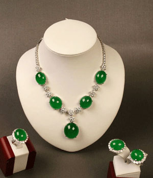 3. 天然玻璃種帝王綠翡翠配鑽石項鍊、戒指套裝,成交價:1898萬元人民幣。