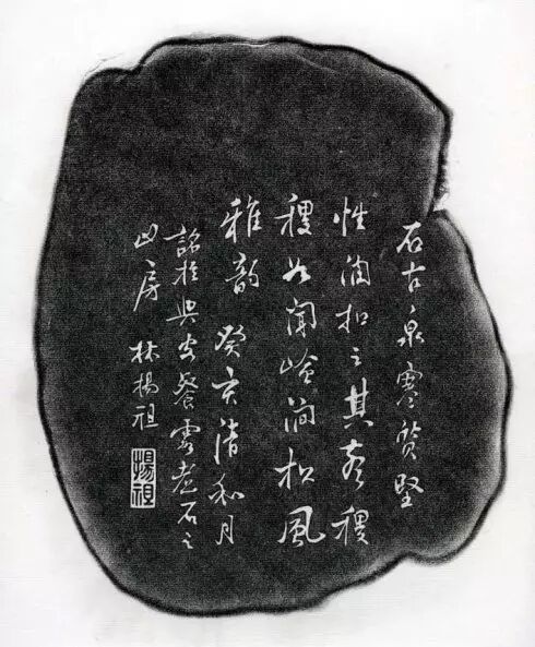 宋坑石。硯背銘文:石古泉寒,質堅性潤,扣之其聲稷稷,如聞嶺澗松風雅韻。癸亥(1863年)清和月,銘於興安餐霞煮石之山房。林揚祖。揚祖(印)。