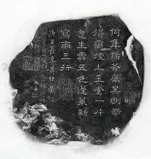 清康熙(1662-1722年)麻子坑石。硯額刻『鋤雲』二字。硯背銘文:何年修斧屬吳剛,帶得蠻煙上玉堂;一片忽生雲五色,蓬萊新寫兩三行,庚子(1720年)長至黃任。黃(印)。任(印)。黃任(1683-1768)字於莘,號莘田,福建永福人。精五七言近體詩。有硯癖,藏硯大家,自號十研先生。康熙壬午(1702年)舉人,官廣東四會知縣。著《秋江集》,多詠硯詩。