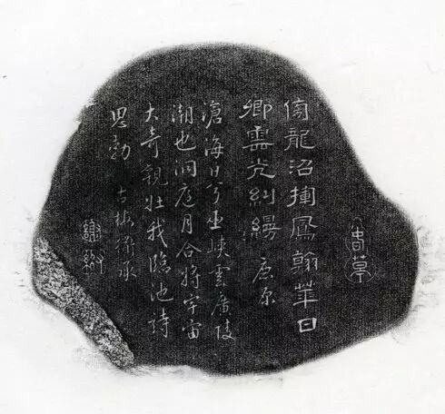 坑仔岩石。硯背銘文:傍龍沼,揮鳳翰,華日卿雲光糾縵。鹿原。滄海日兮巫峽雲,廣陵潮也洞庭月。合將宇宙大奇觀,壯我臨池詩思勃。古梅道承。謝(印)。又紹(印)。