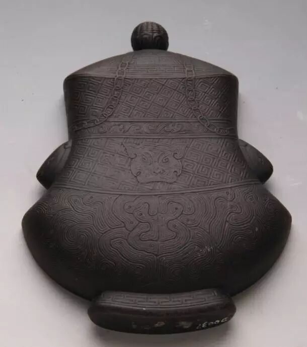 老坑石。硯形、紋飾仿商周時期的提梁壺,反映出清中期的好古之風和精湛的雕刻水平。