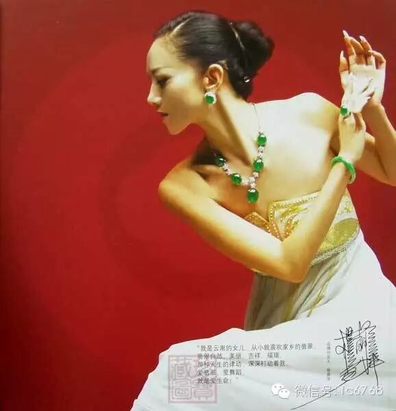 看楊麗萍佩戴翡翠首飾所散發的迷人魅力,由9顆汲天地之精華、聚萬載日月之靈氣的老坑玻璃種翡翠組成,種質極為細膩瑩潤,顏色鮮豔亮麗,翠色鮮潤、種水飽滿,十分難得。