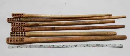 捶石球的小棍長這樣。這是根據出土球桿製作的複製品,木頭不經放,原件已經爛兮兮了。