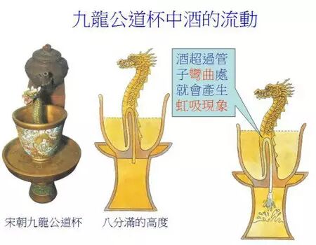 宋朝九龍公道杯。為了防止喝酒過度,在酒杯中央的龍身上,會有一個小口。若倒滿,酒就會全部流走。太牛了!!物理學啊!壓強神馬的!