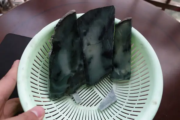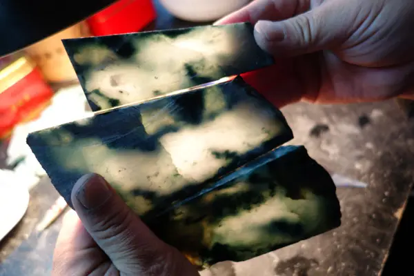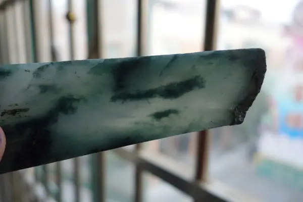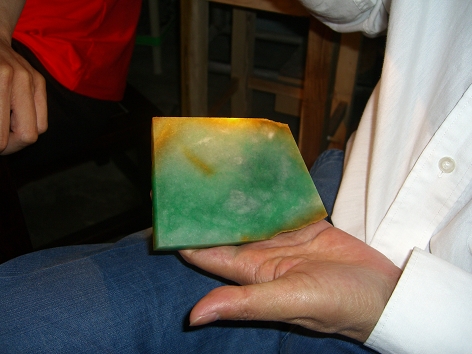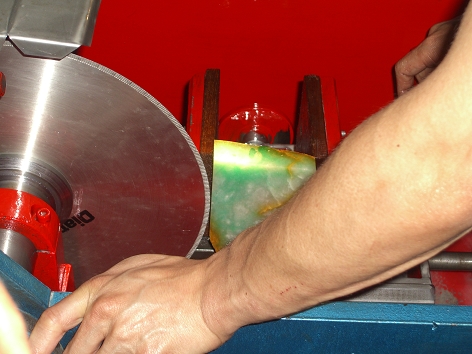 經過第一刀,對玉料的顏色、裂紋分部和水頭等情況更清楚,開始切片準備。