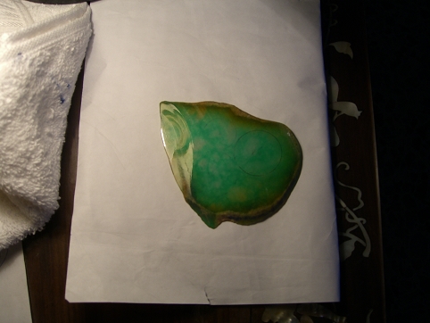 另外,一塊黑皮料子出的幾塊冰飄花片料,玩過毛料的翠友們應該都知道黑皮的料子種一般都是比較老的而且都帶有一定的油度,看上去是不是感覺其貌不揚,灰不拉積的。但是大家可不要看走眼了它哦,看著髮灰發陰發暗的地方偏偏是種老水足的地方,大家看透光照片應該能感覺的到它陰暗部位的種和水有多美。