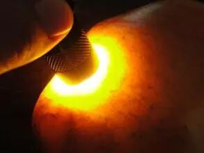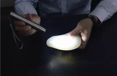 通過強光手電的照射,我們能看到寶物內部是否有紋裂,有裂的地方會有隔光效應,(注意不能用太亮的光線,太亮的光線會打穿裂紋而透光,這樣就看不到隔光效應了);