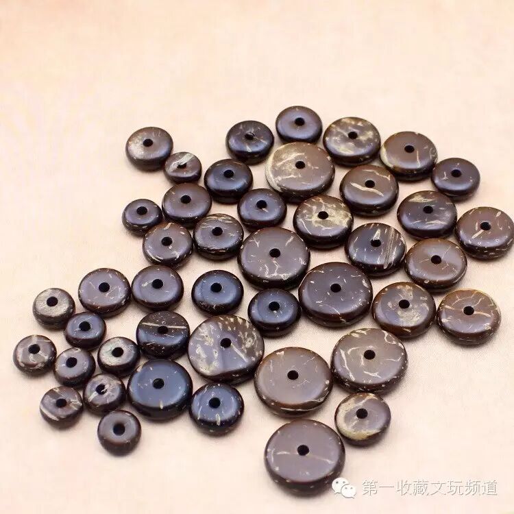 椰,或作“枒”,是一種生長在熱帶地區的常綠喬木。果實叫椰子,可用來製造佛珠。椰殼也叫耶蒂,椰殼念珠即用椰殼磨製的佛珠。椰殼佛珠也是果實類佛珠的重要代表。從下圖也可以看出,椰珠都是片狀的。椰殼佛珠厚度越高價值越高,1-2MM的大多用作隔珠隔片