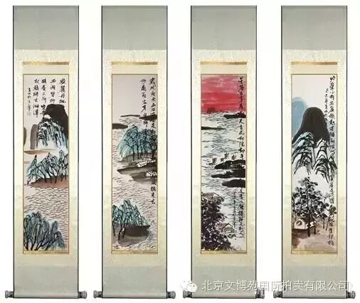 這組條屏的名字十分討喜,寓意吉祥。齊白石四幅山水條屏中,均有山有水,山聚人氣水聚財,寓意貴人相助、財源滾滾;張大千的四幅花卉條屏畫的分別是梅、蕉、桐、松,象徵著高潔、瀟灑、堅貞、聖潔、勇敢、長壽等吉祥寓意,兩組條屏合稱《南張北齊·富貴吉祥》條屏!