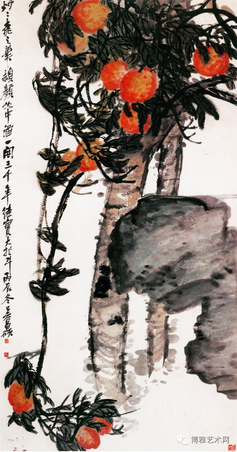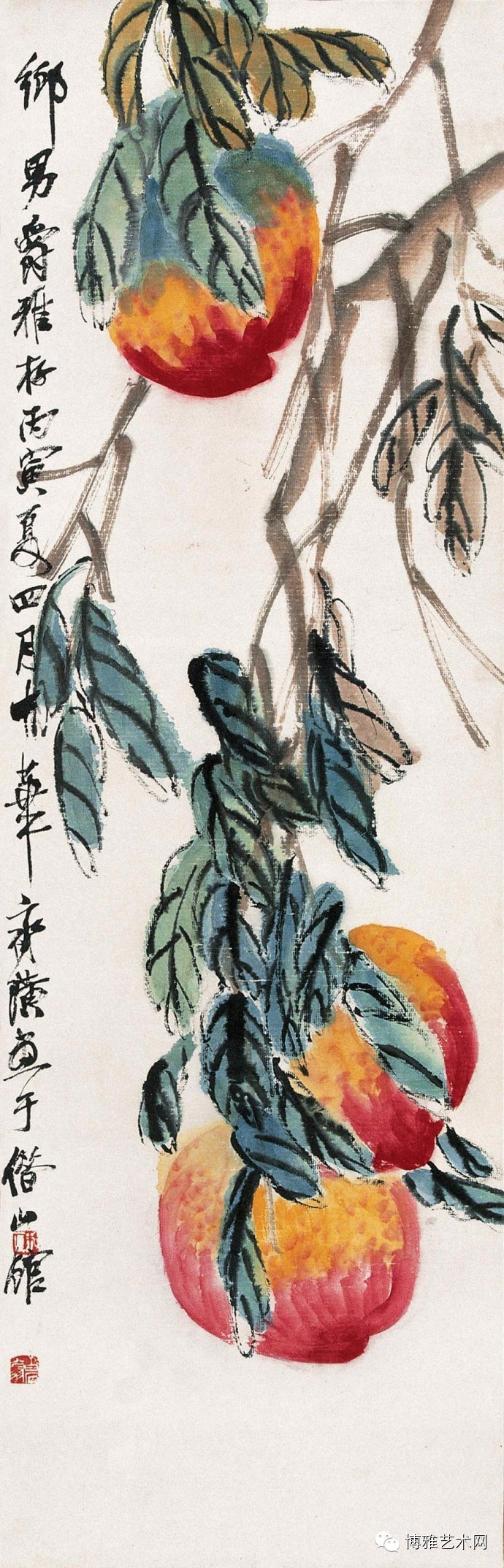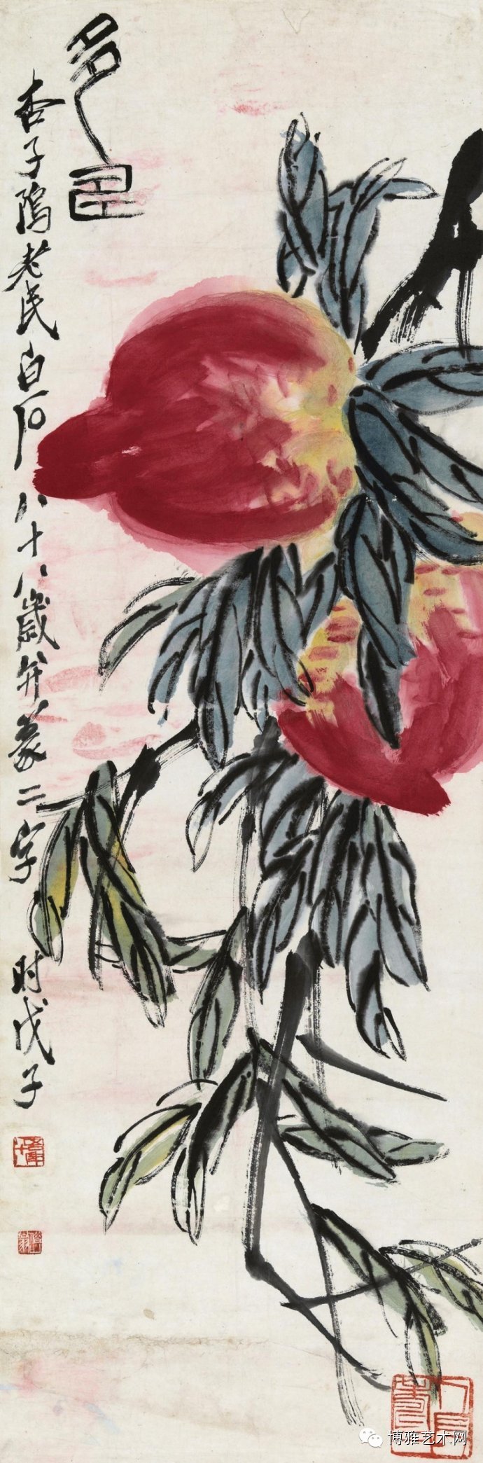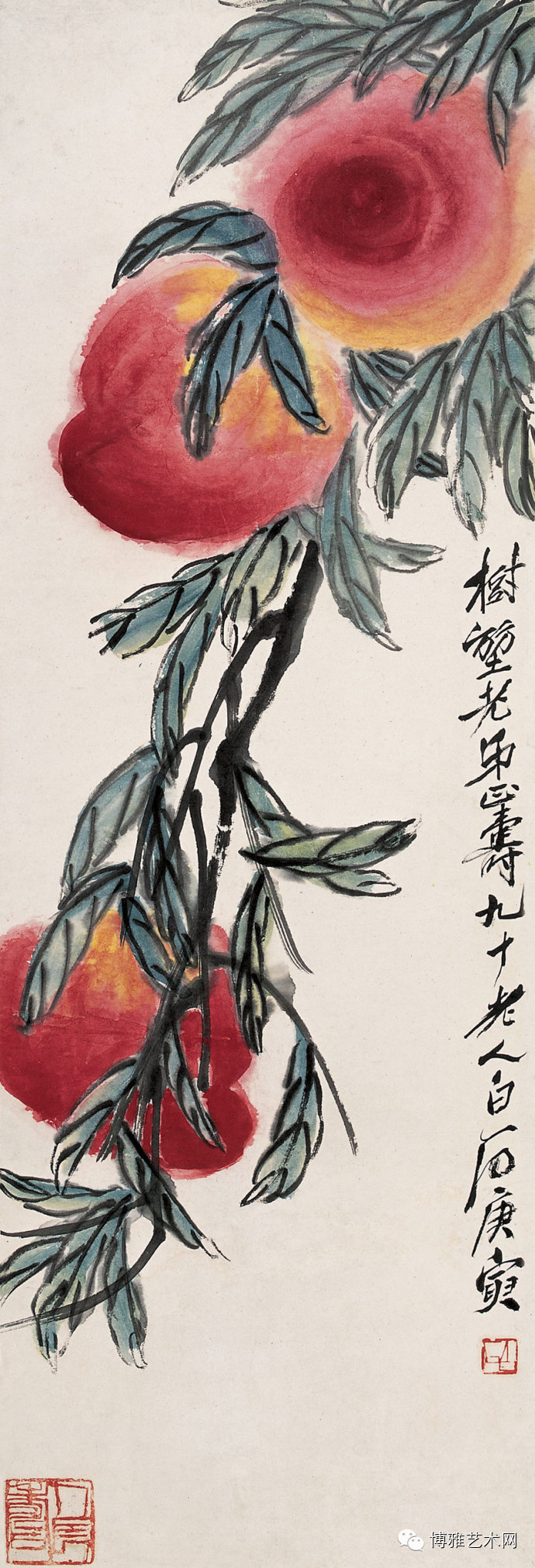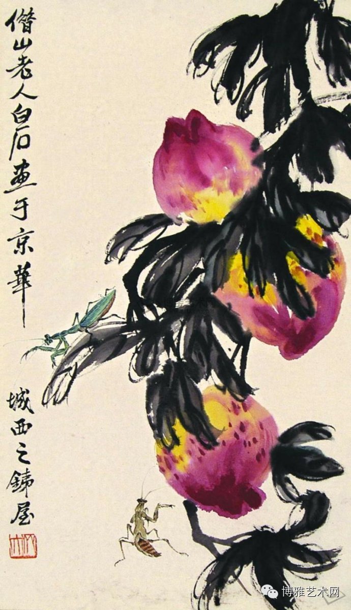 齊白石衰年變法,多取法老缶吳昌碩;但這取法又不是簡單的模仿,而是筆墨精神。他自己說:“我是學習人家,不是摹仿人家,學的是筆墨精神,不管外形像不像。”其中尤以畫桃極為神似。