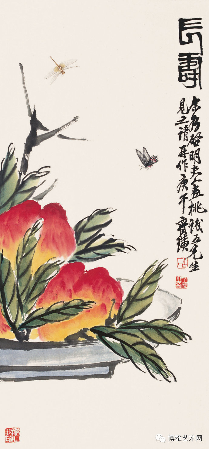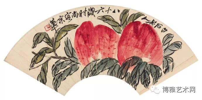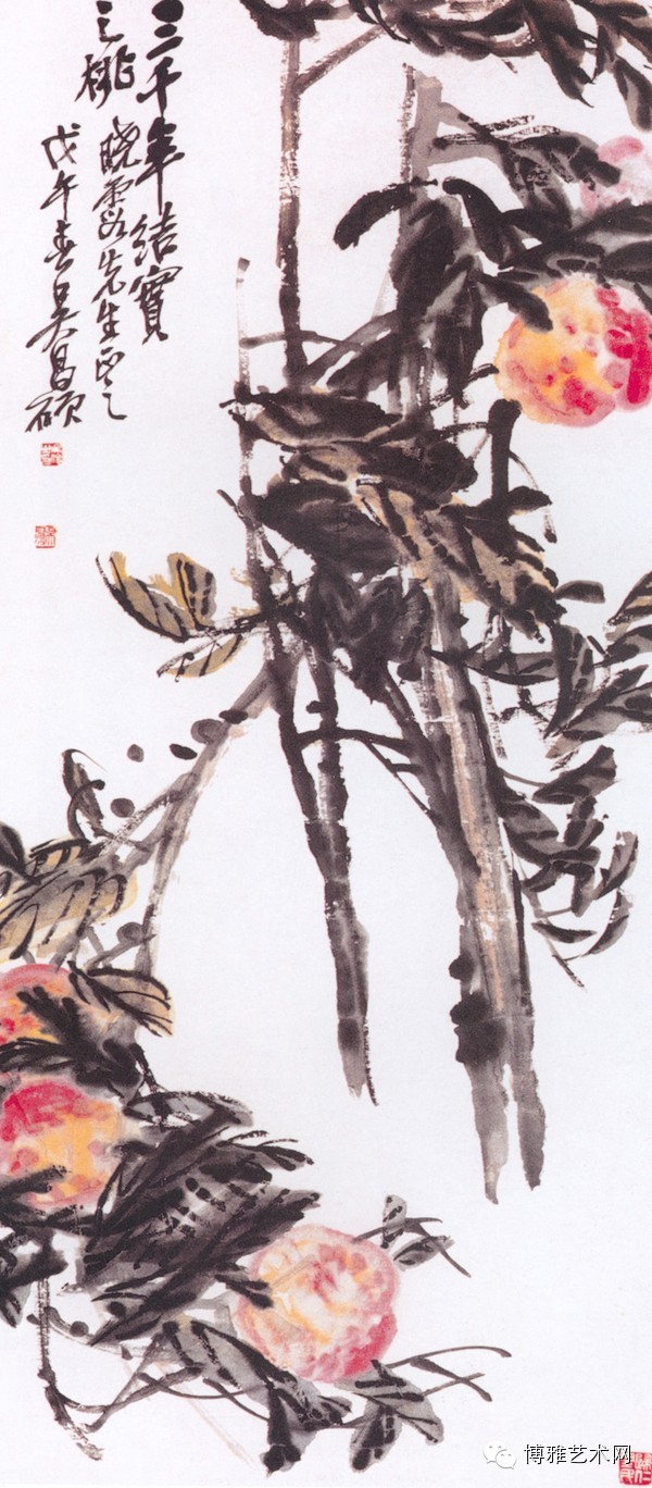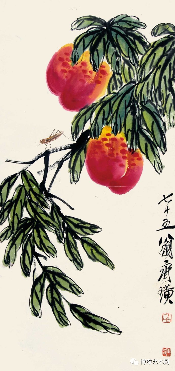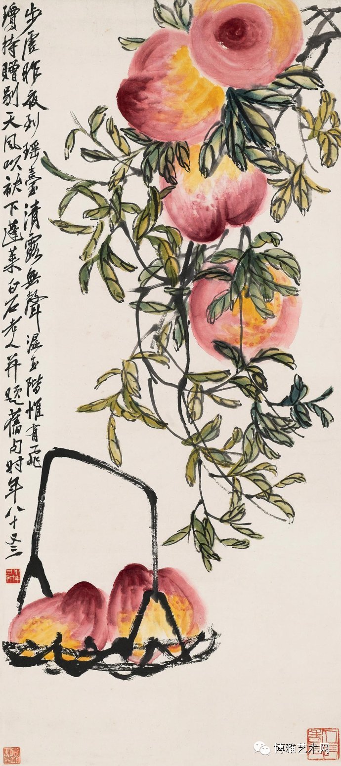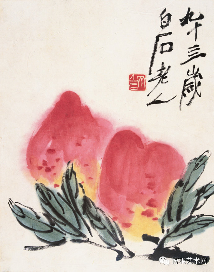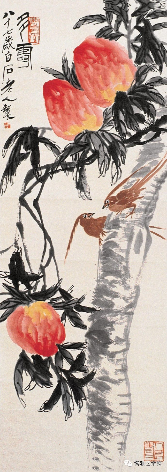 齊白石畫桃,先以沒骨大寫意法直接用洋紅潑寫碩大桃實,滲以少許檸檬黃,再以花青、赭墨寫出葉子和枝幹,後用濃墨勾勒葉筋,設色濃重艷麗。與其畫荷花所創的紅花墨葉恰成強烈對照。不僅桃實的分佈頗具匠心,極臻疏與密、藏與露之妙,即壽桃的向背光都以顏色的變化來確切地表現出來。