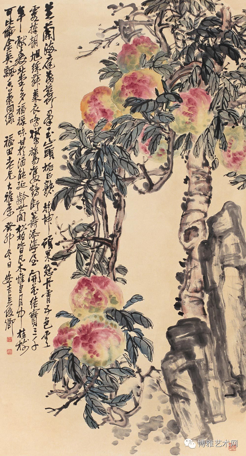 《桃實圖》繪兩棵壯實的桃樹,樹上碩果豐實,樹下一塊巨石矗立,而樹上的一枝連同桃實垂直倒偃在地。桃葉用濃墨寫出,枝葉穿插。圖中自題:"灼灼桃之華,赬顏如中酒,一開三千年,結實大於鬥。丙辰冬吳昌碩。"鈐"俊卿之印"、"昌碩"白文印。丙辰為公元1916年,吳昌碩時年七十二歲。