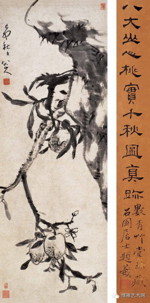 此幅作品是八大山人鮮見之題材,晚年力作;原藏錢鏡塘,再藏賴少其,何人續藏,福緣大至也。餘得讀網絡之圖像,亦一福緣也。中國的花鳥畫在進入元代之後出現了寫意的萌動,尤其在明末清初演變成大寫意花鳥畫的洪流,明代後期有青藤白陽之新變,清初有八大山人之淋漓奇崛。八大山人的繪畫秉承家學,並受到明末流行之董其昌畫風的影響。山水、花鳥兼擅,八大山人創造性地發展了大寫意花鳥畫,以深厚的書法功底和山水用墨方法為依托,把花鳥畫緣物抒情的傳統推向極致,將物像人格化、符號化,寄託自己的身世之感和孤傲情懷,造型誇張,但形象洗練準確。按風格和署款不同,八大山人的繪畫可以分為三個時期,1659-1684年為僧號期,1684-1694為八大前期,1695-1705為八大後期,不同時期有明顯可辨別的署款。此圖署款己卯秋日,為康熙三十八年(1699年),時年八大已74歲,並且八大的署款形態與後期寫法完全一致。此圖比較充分地體現了八大山人花鳥畫的特色,首先此畫構圖簡練,以一石和二枝桃為主體,物象並不復雜,但能做到少而又厚實得趣,畫史上少有人能得此造詣。而石頭和桃枝的結構與八大山人書法的習慣結構幾乎一致,這也是書法與繪畫相通之又一例。構圖造型之奇亦可在此圖中略見一斑,八大山人常常出奇制勝,在我們通常的印像中,白眼魚、獨腳鳥,兀立之石是八大的專利。此圖雖非常見之魚、鳥、荷花,而奇崛之勢仍令人驚嘆,石塊斜出於右上角,二桃枝從石之中橫空而出,其中一枝更是伸向右下角,與右上角呼應,中間的大塊留空既讓右上方保持充實之感,又使下方的桃枝更加有舒展之態。其次此圖體現了八大用筆的特色。八大山人在清康熙三十二年(1693年)所作《癸酉山水》冊中題到:“昔吳道元學書於張旭,賀老(知章),不成,退,畫法益工,可知畫法兼之書畫。八大作品早年用筆方硬,進入八大前期後逐漸豐厚渾圓,富於變化,越到晚年,筆法越益含蓄圓潤。此畫筆法靈活圓潤,既表現了物體之質感,又體現了墨法的豐富性。明代中期以前,繪畫多用熟紙,熟紙不湮不走墨,乾濕濃淡,可層層渲染。明代中期以後,“生紙”增多,在生紙上作畫,易湮墨。而八大山人充分利用生紙這一特性,通過用筆中水份的控制,使筆墨產生更豐富的變化,孕育了在熟紙上所不能達到的藝術效果。此圖中右側石塊之質感就是通過不同層次的墨暈來實現的,石質感覺堅實而圓潤。兩枝桃更是採用濃、淡、幹、濕不同的墨來營造豐富的表現力,老乾或用淡而乾之墨,或用濃而重之墨,新枝與老乾之對比又使新枝益發體現了生命力,而枝葉的陰陽向背又無不是用墨之功。可以說,八大是成功地使用生紙推動中國水墨寫意畫的重要人物。此圖為八大作品中比較少見的題材,八大花鳥畫的題材多為魚、鳥、荷花,而桃實圖在後來的海派作品中至為常見,因為桃實寓意多為祝壽之用,而八大作品多為“緣物抒情”之功用,所以桃實圖很少見,在近些年拍賣的八大作品中亦為罕有之品。另外值得推薦的是此圖是經名家收藏之作,八大的作品在當時並非主流的畫風,所以在清代宮廷中幾無收藏,清宮所藏八大同時代的作品多為四王吳惲之作。八大的作品作為明末清初繪畫新變的傑出代表,影響了揚州畫派、金陵畫派、海上畫派的成長。至近代西方藝術觀念傳入,八大的作品成為個性抒發的代表,收藏者日眾,價值亦日漸凸現。大收藏家錢鏡塘得此畫後,並重新裝池,由張石園先生題簽。錢鏡塘先生為當代收藏大家,精鑑又善待藏品,對大多數書畫藏品重新裝裱,海內外收藏家得錢氏遞藏之作,無不奉為至寶。之後傳入賴少其收藏,賴先生也為當代名家,所作所藏均有名於世。此次獻拍,即得之賴家支持。《桃實圖》為八大作品中難之品,得藏者可謂福緣大至!