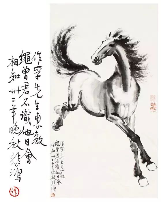 藝術大師徐悲鴻先生之所以能學貫中西,是因為他有良好的中國畫創作根基,後來又結合了留法所習西畫精義。他曾提出:“古法之佳者守之,垂絕者繼之,不佳者攻之,未足者增之。”對西畫則“可採入者融之”,故徐悲鴻十分重視素描、速寫及對於繪畫中光色的分析研究和總結提高。徐先生創作的題材十分廣泛,山水、人物、花卉、鳥獸都有很大的成就,特別是他畫的馬融合了西畫的技巧,達到了前無古人、後無來者的境界。無論是群馬、孤馬、奔馬、立馬等均以大寫意法來表達,英姿勃勃,無拘無束,倜儻灑脫。