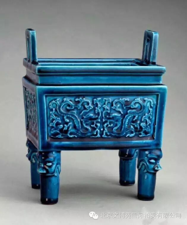 (清康熙孔雀綠釉凸螭紋方鼎)