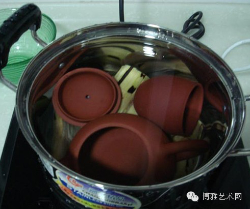 首先徹底清理紫砂壺的污漬(包括遺留的金沙、沙粉等),用沸水內外沖洗一次,然後乾淨的壺巾沾清水細細擦淨,然後待壺自然風乾。然後將茶壺放進沒有油漬的煲,加3倍高度的水(清水的量以淹過壺1寸許即可)煮一小時,這樣茶壺的泥土味及火氣都會去掉。