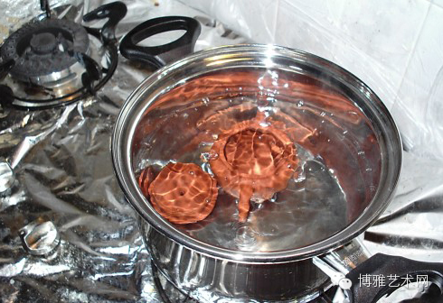 2,以“貓須草”(藥店有售,很便宜,即“化石草”,平時治療各類結石的中藥)10-15g,荔枝殼3到5個,鮮毛竹葉5-8片。以棉紗布包紮後以清水煮之,開水3-5分鐘後待其冷卻後,再放進愛壺,同煮,30分鐘,期間水量減少後需立即添加,務必使水漫過壺體。如果是紅泥朱泥壺,最好加柳葉5-8片,與竹葉同時煮,效果更佳。冷卻後,撈出愛壺。進入下一個程序。荔枝殼以新鮮為佳,季節不對時,用“幹荔枝”的殼也行。