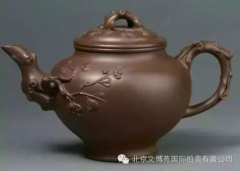 “梅報春壺”原為江蘇宜興紫砂工藝廠陳列室藏品,以梅花報春為題,在挺秀飽滿的壺身上,運用雕鏤和捏塑等多種手法,生動地刻劃了梅花不畏風霜嚴寒之英姿,端麗穩重,精緻傳神。本壺的設計者朱可心為民初紫砂名師,朱氏擅長花貨造型,喜以鬆、竹、梅為題材,所作茗壺,皆法度諧宜,生意盎然,韻神俱佳。