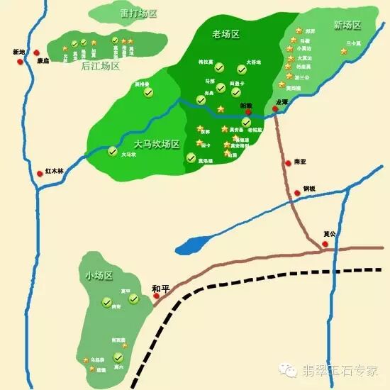 4、後江場區:因位於康底江又稱後江江畔而得名。產區地形狹窄,主要在長約3000多米,寬約150米的地方,散佈著10個場口,最著名的場口是格母林、加莫、莫東郭、不格朵。雖然地方狹窄,但後江場區產量高,品種多,質量好。其局部地區已開採到第五層:第一層仍為黃沙皮,第二層為紅蠟殼,第三層為黑蠟殼。