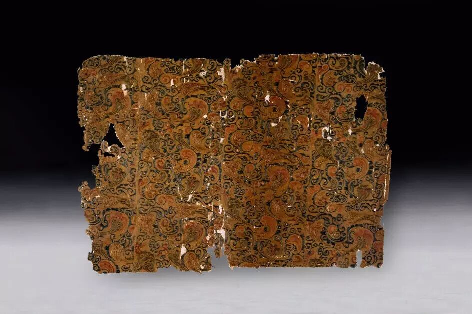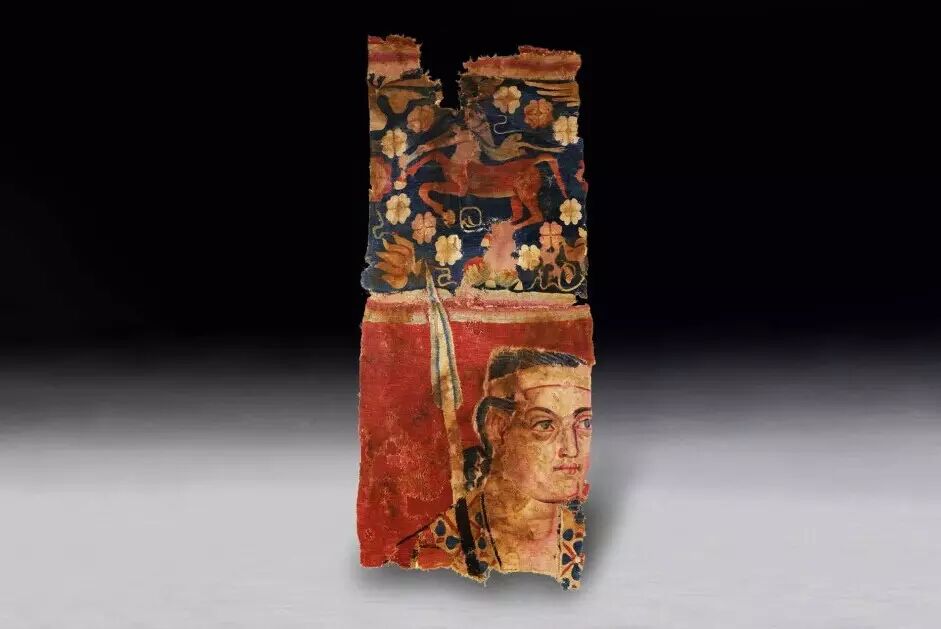 藍地人首馬身紋毛布:新疆維吾爾自治區博物館藏品原是一幅大型掛氈的一部分,出土時已被剪裁成四塊,縫接在一條褲的下端。