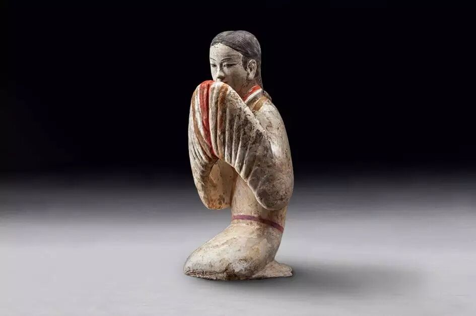 塑衣式彩繪跽坐拱手女俑:漢陽陵博物館藏品出土自陝西省咸陽市西漢陽陵陪葬墓園塑衣式彩繪跽坐拱手女俑。