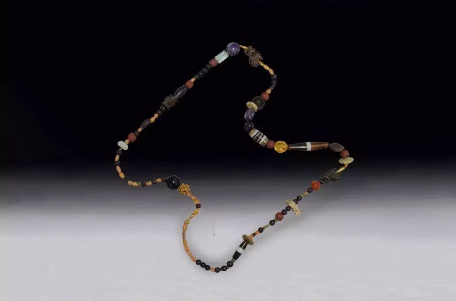 水晶瑪瑙珠串:廣州市文物考古研究院藏品串飾由多顆形狀丶色澤各異的瑪瑙珠丶水晶珠和金球組成,其中一顆是飾有焊珠的鏤空十二面菱形小金球。