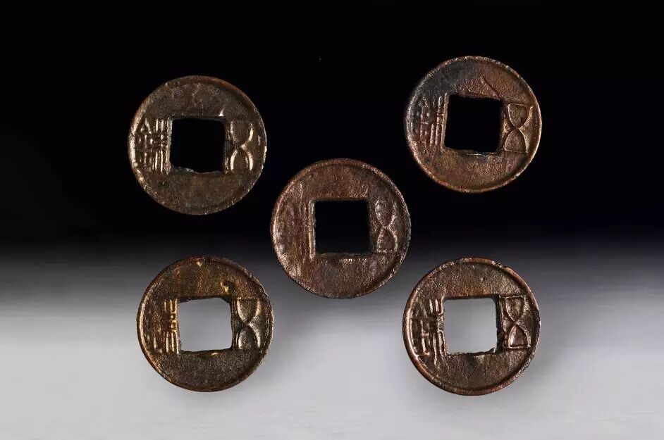 「五銖」銅錢:陝西省考古研究院藏品西漢五銖錢為圓形丶方孔,大多在邊緣地方突起,稱為「外郭」,幣上鑄有錢文「五銖」。
