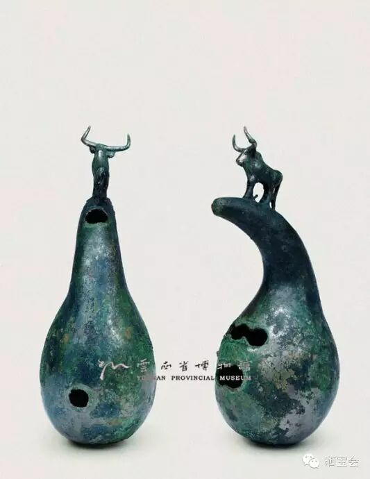 1972年出土。器物仿葫蘆形狀正面開5個孔,背面開1個孔曲管上開一小孔並立一小牛,牛角長而內翹,長尾拖於地顯得嬌小、恬靜、可愛,器管自然彎曲,造型奇特,構思精妙,令人拍案叫絕。