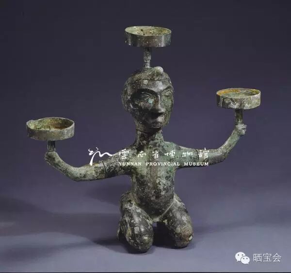 出土地:個舊黑螞井器物為一裸體男子呈跪坐狀。腹部和跨下有帶纏繞;雙手分別向兩側平伸,手中各持一圓形燈盤;頭昂立;頭頂上又立一圓形燈盤。燈與俑搭配和諧,給人一種美感。