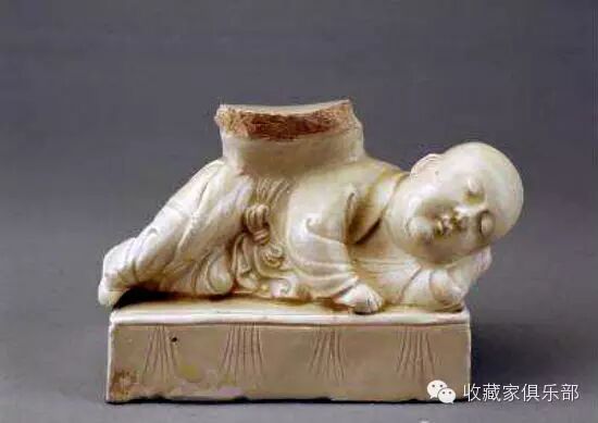 瓷枕上施以彩釉,並繪精美的圖案,或花鳥魚虫、珍禽野獸;或詩詞歌賦、格言警句;或山水人物、日月星辰,還有很多反映人們日常生活場景的畫面,意趣盎然,生動活潑,雅俗共賞。如“童子釣魚圖”瓷枕就是一例:小河邊,一孩童持竿垂釣,神情專注,幾條小魚欲咬欲溜,童趣盎然,遠處,寥寥三條波紋表現了緩緩流淌的河水,使人頓生清風徐來、水波不興之感。如現藏於北京故宮博物院的定窯孩兒枕聞名中外,其枕造型為一男孩臥於榻上,他雙臂環抱墊起頭部,右手持一繡球,兩足交叉上翹,一副天真頑皮的神態。胖胖的圓臉,雙目炯炯有神,身著長袍,外穿坎肩,下著長褲。衣紋線條和衣著、木榻上的刻花裝飾簡潔流暢。定窯白潤的色調和質感,給人以自然恬靜、雅緻高潔的藝術感召力。不但磁州窯瓷枕上兒童題材的紋飾很多,同時期其他窯址出土的瓷枕,也多有憨態可掬的兒童形象,如踢球的、拍鼓的、執蓮的……這些童子形象的瓷枕畫面在繪畫風格上一脈相承,極富時代特徵。這些瓷枕,每每觀之,總令人耳目一新。