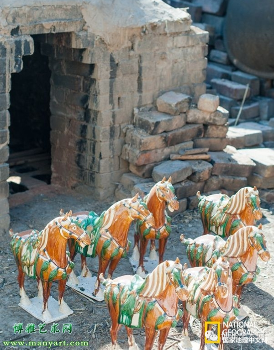 掛上釉色以後,便進入第二次燒造,稱“釉燒”。在900℃的高溫中,這些釉料的顏色發生奇妙的變化,在烈火的烘烤之下,黃、綠、褐等顏色釉被表現得絢麗多姿,它們自然垂流,相互交融,顏色在泥胎上奔跑,如同它誕生的那個時代那樣自由而奔放。
