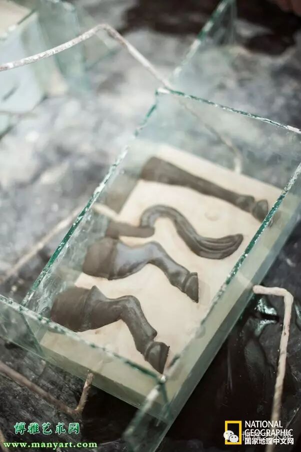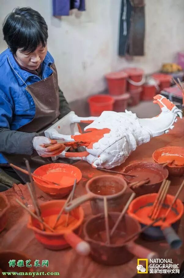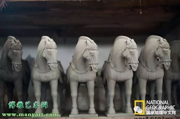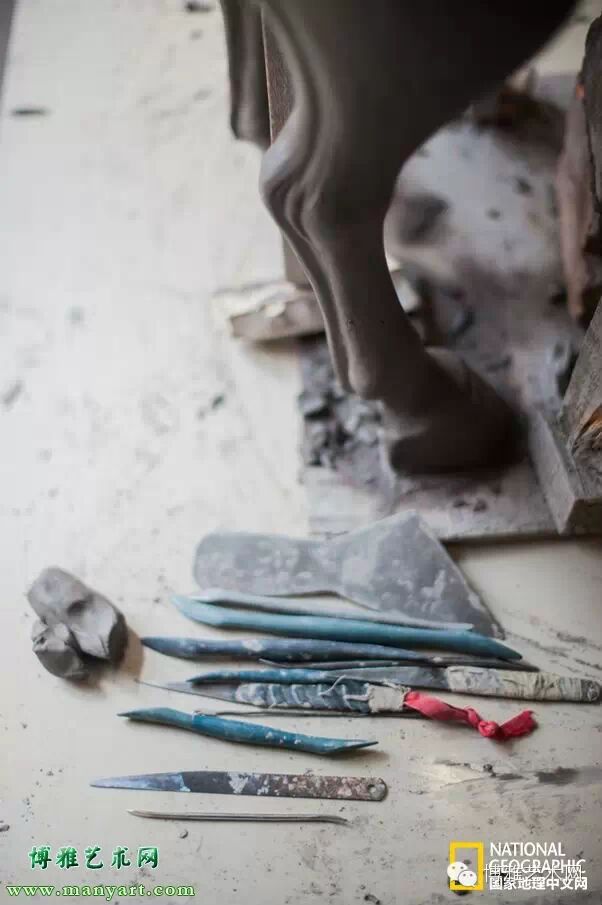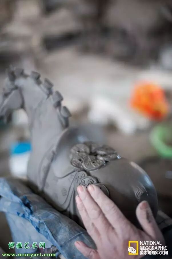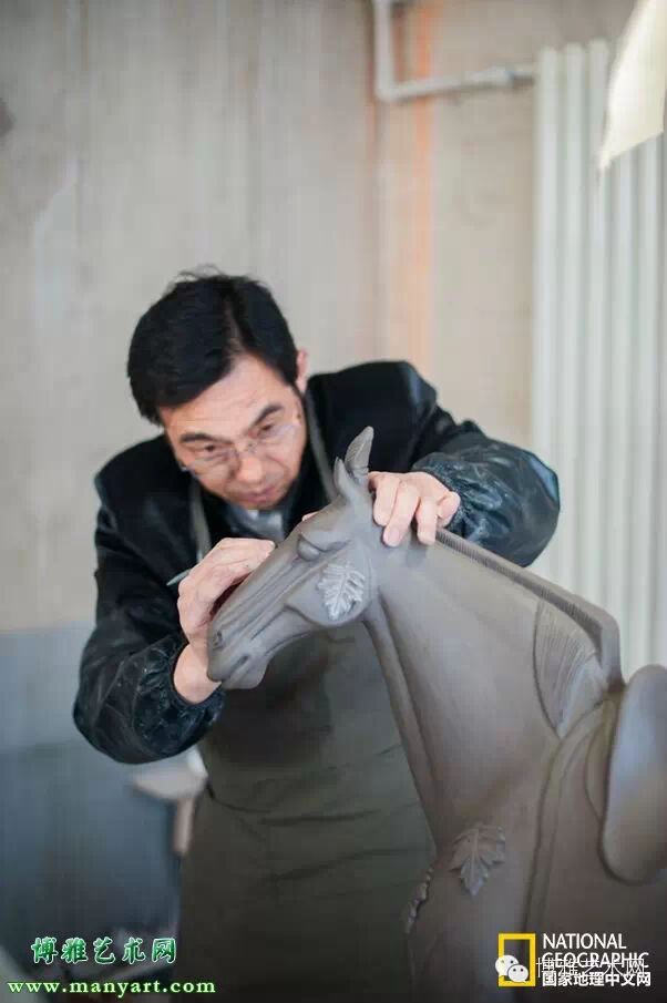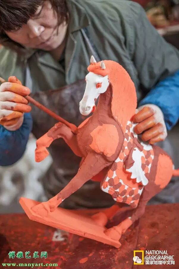 有了優質的原料以後,就是塑形了。圖中高水旺正在雕塑一匹半個人高的駿馬。在製作大型或者較為複雜的三彩時,通常是採用雕塑成型的方法。高水旺說,最難雕刻的部分是馬的眼睛和嘴巴。牽一發而動全身,一匹馬的全部靈氣就匯聚在這兩個部位上。眼睛要怎麼修才能帶神,嘴巴要怎麼咧才有勁,這裡面可都有講究。