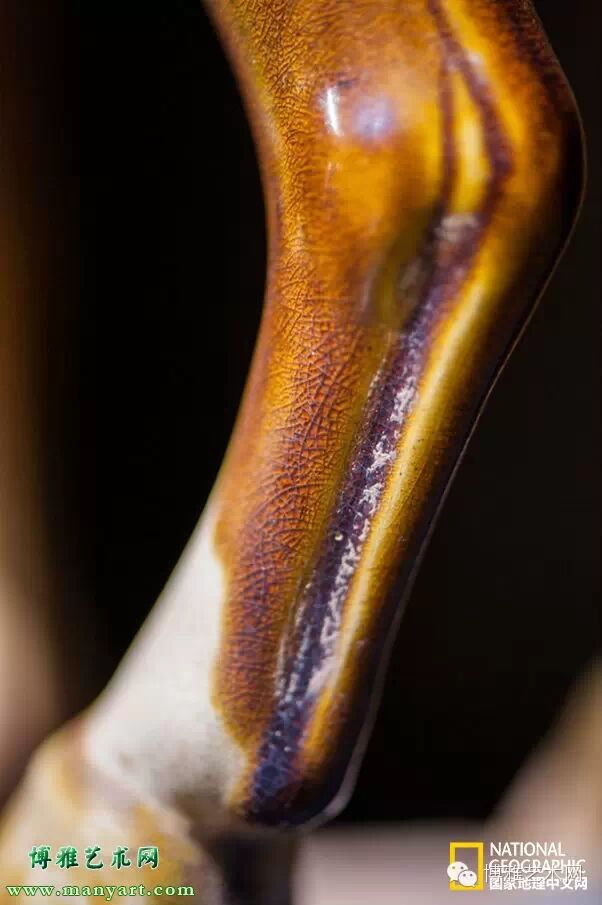 在最後的燒造過程中,窯爐內會發出“噼嚦噼嚦噼嚦”清脆的響聲,這是釉片的開裂。這一過程形成了唐三彩特有的紋理,一些細密的裂紋,你只有貼得足夠近才能看清,它們被形像地稱為“蜻蜓翅膀”。