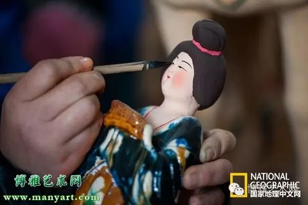 如果是仕女俑,還得再加一道工序,叫作“開相”。為了表現人物更為細膩的表情,仕女的臉部通常不施釉,而是改用礦物顏料來塗畫。