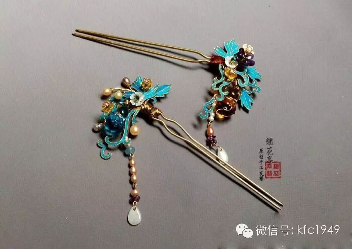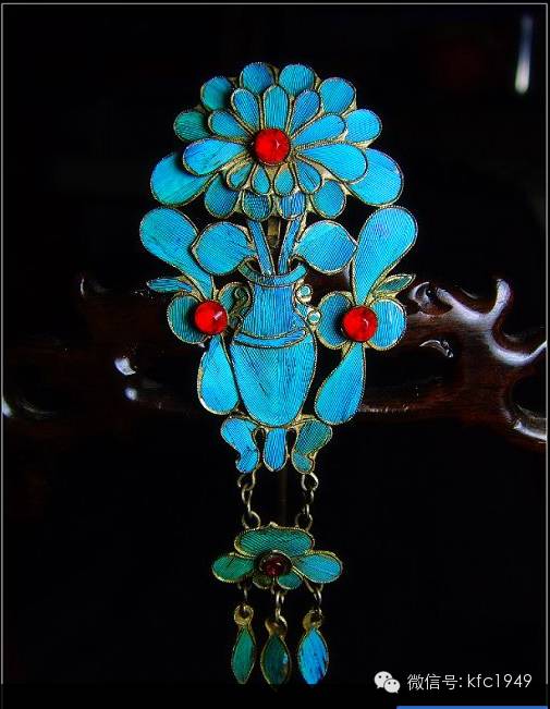 髮簪 :形式種類繁多,有蝴蝶、蜻蜓、蟬、螃蟹、蝙蝠、蜘蛛、蟈蟈等各種動物,佛手、靈芝等各式花草,有吉祥紋飾圖案,還有較為罕見的以龍為題材的簪。幾年前在香港拍賣過一隻翡翠龍簪,據拍賣行講,貴為皇后亦不過用鳳簪,而敢以龍作髮簪的女性估計非慈禧莫屬,所以這一髮簪很可能為慈禧所用。遺憾的是那隻髮簪翠質一般,定價也偏高,記得最後成交不太理想。