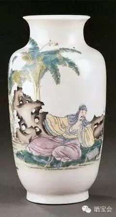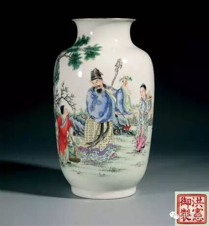 郭葆昌在景德鎮督陶時,還為自己燒製了一批瓷器。署款有“觶齋”(因為他曾收藏了一件珍貴的青銅觶——商周時期的飲酒器,便將書房命名為觶齋)、“觶齋主人”、“郭世五”、“陶務監督郭葆昌謹制”等。這批瓷器帶有濃厚的文人趣味,以瓶類為主。器型雍容典雅,線條簡潔,瓷繪以人物和花卉為主。它們或多或少寄託了郭葆昌的一點人生理想,他雖然是古董舖的小學徒出身,但總還是願以文人自居。所以他的私款瓷,花卉以疏淡為基調——著色清淡,佈局疏朗,沒有一般民國粉彩花卉的浮華濃豔之俗(如圖四粉彩花卉過牆枝大盤)。人物多為高士圖,姿態恬淡,不過表現出的可不是一點淡泊的風雅,而是功成身退後隱逸的悠閒(如圖五粉彩高士圖瓶、圖六粉彩五老圖瓶),因為郭葆昌本身就不是不求聞達的一介寒士。督理陶務使他進一步發跡,當了幾個月的督陶官後,他在河北定興縣老家蓋起了一座大宅,蓋房所用的銀元都是布袋裝放,用火車運去的。從此他就成為定興縣的四大富豪之一。一任督陶官就能如此顯赫,可見袁世凱為了這批禦瓷真的是不惜血本。