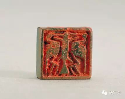 舞樂雜技圖案銅印,西漢,印面1.4×1.4cm,通高1.3cm印銅鑄,鼻鈕。印面凹鑄圖案,4人各據一角,右上角之人邊歌邊舞,右下角之人跪坐吹奏似竽的樂器,左上角之人彈奏橫於座前的瑟,左下角之人似在表演拋戲雜技。