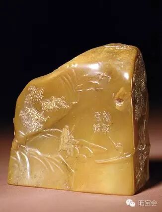 由於田黃石珍貴難得,故在章料的雕飾上往往用其原形,巧妙地運用田黃石與外層皮色,使圖案層次明晰。一側為一老者拄杖待舟於岸,隨身小童招手呼舟,梢公撐一葉扁舟前來,岸上秋木蕭蕭,天空中寒鴉歸林,一派秋韻野渡的意境。另一側表現一長者頭戴氈笠,擁裘,策蹇而行,一童子擔篋隨趨於後,路旁樹木凋零,秋意已濃,雕工與構圖頗具巧思。