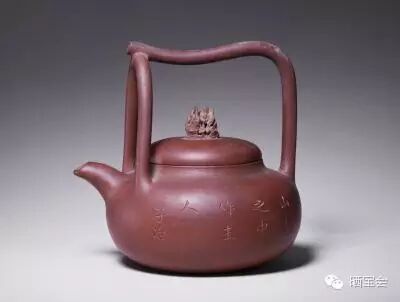 宜興窯愙齋款紫砂提梁壺,清光緒,通高13.5cm,口徑6.55cm,足徑10.9cm。