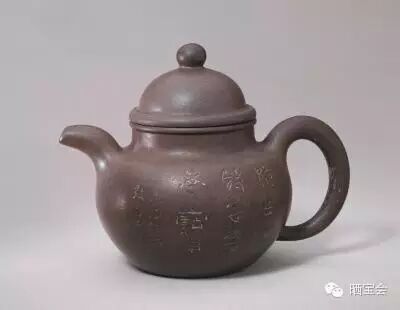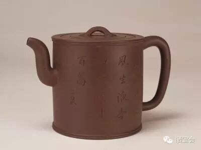 宜興窯友蘭款紫砂詩句溫壺,清嘉慶,高9.9cm,口徑9cm,底徑9.1cm。