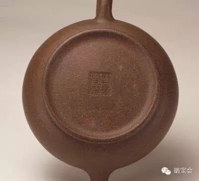 壺菱花筋囊式,長彎流,曲柄。五出邊菱花式蓋,寶珠鈕。底有“陳殷尚制”四字隸書印章款。深栗色砂泥,砂質極細,色調純正。