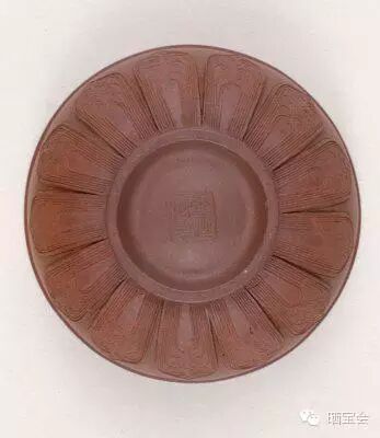 碗口微撇出邊,圈足起弦線。碗上部光素,下部凸雕十三枚蓮瓣,每瓣內以細線勾勒筋脈。底有篆書“惠逸公制”四字印章款。深紫色砂泥,細潤光潔。