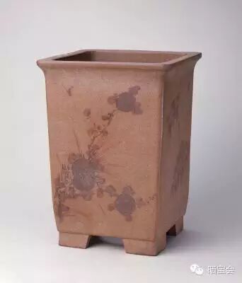 花盆四方形,深腹,下承四折角條形足。栗褐色摻黃色粗砂泥。花盆外壁四面均有泥繪花卉裝飾,優雅美觀。