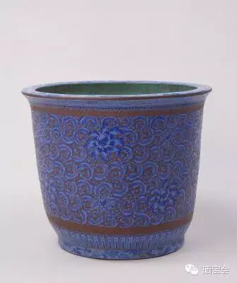 此盆形體碩大,彩繪精細,所施藍彩與紫砂胎的深褐色搭配和諧,素雅而不失活潑,它是清乾隆時期皇室栽種大型盆景的理想用品,故宮博物院現藏有4件。