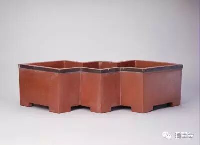 花盆為三連斜方式,口邊三折曲線,平底有二圓出水孔,下承八折角隨形足。盆口以深栗色泥鑲邊,盆身為朱紅色砂泥。此盆形狀採用三連幾何斜方體,打破了花盆造型的一般規律,風格獨特,別出心裁。