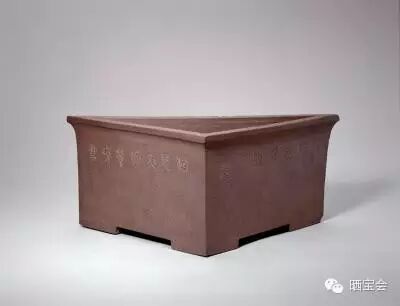 宜興窯紫砂暗刻蘭花詩句三角花盆,清雍正,高13cm,邊長35cm。