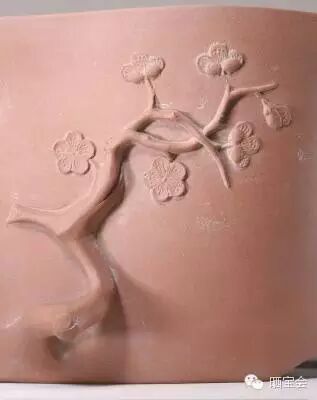 花盆樹樁式,外壁凸雕梅枝。紫紅色砂泥,細膩光潤。
